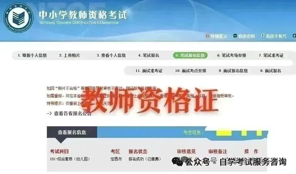 笔试报名采取网上审核,考生提交报名信息后,在审核时段内及时登录报名网站查看审核结果。审核通过后考生信息不得修改;由于照片等个人信息不符合规定,审核不予通过的,在审核结束前须重新登录报名网站修改个人信息并提交。如未通过审核且原因不明,可电话咨询所报考考区(联系电话见附件3)。
